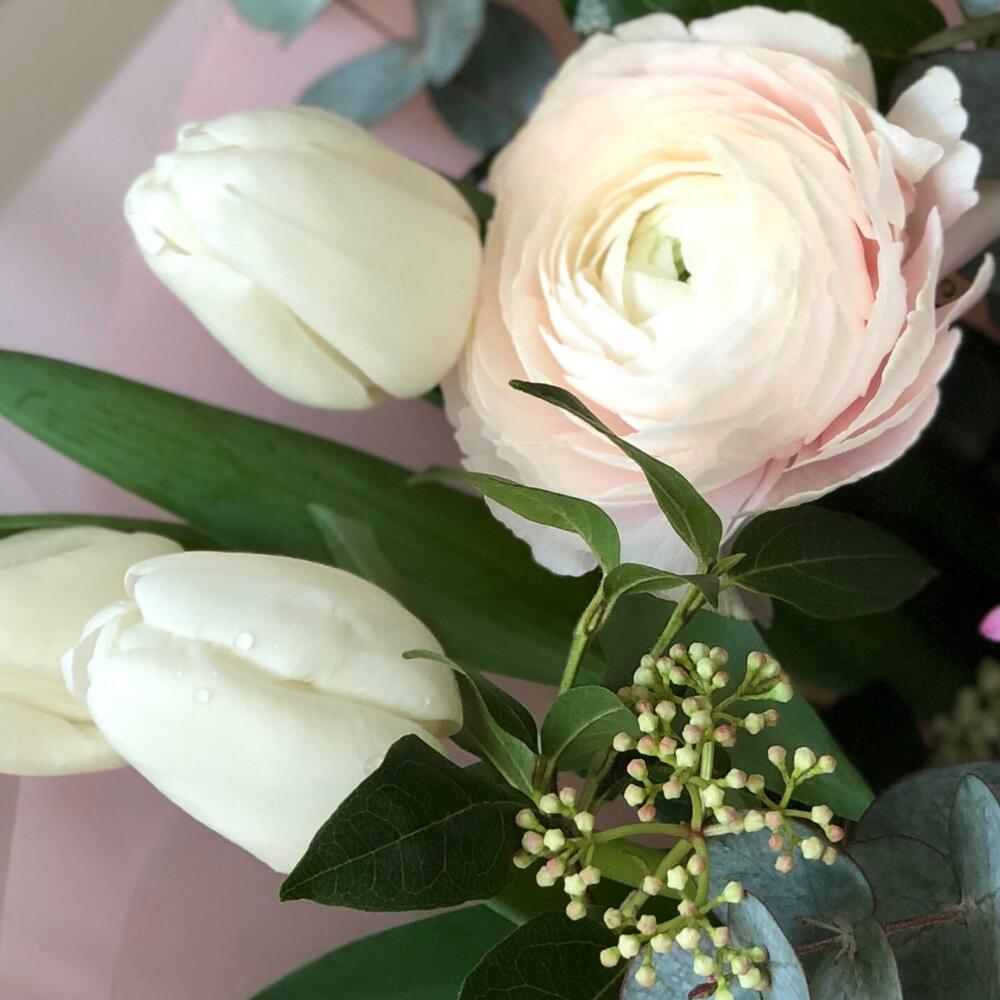 Нежный букет комплимент с ранунклюсом , ароматными гиацинтами , и белоснежными тюльпанами .
